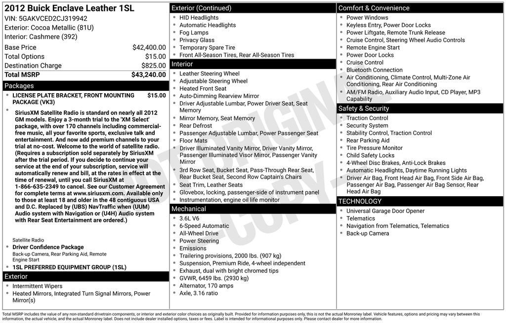2012 Buick Enclave Leather Group 3.6L V6 SIDI DOHC VVT 16/22 City/Highway MPG AWD AWD.