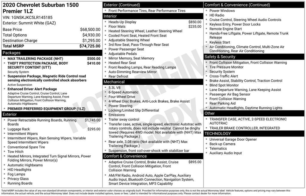 Olson Chevrolet is Family owned and operated In Redwood Falls and Hutchinson. Our business actively participates in the community through Community Events and Sponsorships. We enjoy Collaborating with and supporting local businesses.Olson Chevrolet is pumped up to offer this 2020 Chevrolet Suburban Premier in Summit White with a Jet Black Leather interior. This Suburban is powered by a Gasoline 5.3 liter 8 cylinder engine with 4WD and Automatic transmission.Certification Program Details: When you select a certified pre-owned vehicle that is less than 10 model years old and has under 100,000 miles, you will receive 6-month/6,000-mile Bumper-to-Bumper Limited Warranty coverage with no deductible, as well as 24-hour roadside assistance.Certified. 2020 Chevrolet Suburban Premier EcoTec3 5.3L V8 14/21 City/Highway MPG 4WD TRAILER TOWING PACKAGE, TRAILER BRAKE CONTROLLER, FORWARD COLLISION ALERT, SIDE BLIND ZONE ALERT, KEYLESS START, DUAL ZONE CLIMATE CONTROL, ADAPTIVE CRUISE CONTROL, LANE KEEP ASSIST, 20 INCH WHEELS, 3'RD ROW SEAT, 4x4, BACK UP CAMERA, Bluetooth®, CHROME WHEELS, COOLED SEATS, HEATED SEATS, HEATED STEERING WHEEL, LEATHER SEATS, HEADS UP DISPLAY, 12-Volt Auxiliary Power Outlet (5), 1st & 2nd Row Color-Keyed Carpeted Floor Mats, 2-Speed Active Electronic AutoTrac Transfer Case, 3.42 Rear Axle Ratio, 3rd Row 60/40 Power Fold Split-Bench, 4-Wheel Antilock Disc Brakes, 6-Way Power Front Passenger Seat Adjuster, Adjustable pedals, All-Weather Floor Mats, AM/FM Stereo w/Navigation, Apple CarPlay/Android Auto, Auto-Dimming Inside Rear-View Mirror, Automatic Emergency Braking, Body Security Content Theft-Protection Package, Bose Centerpoint Premium 10-Speaker Surround Sound, Color-Keyed Carpeting Floor Covering, Driver Inboard & Front Passenger Airbags, Electronic Cruise Control w/Set & Resume Speed, Enhanced Driver Alert Package, Floor Console w/Storage Area, Fog Lamps, Forward Collision Alert, Front & Rear Park Assist, Garage door transmitter, Hands-Free Power Liftgate, HD Radio, Heated 2nd Row Outboard Seats, Heated Leather Wrapped Steering Wheel, Integrated Trailer Brake Controller, IntelliBeam w/Automatic High Beam On/Off, Lane Change Alert w/Side Blind Zone Alert, Lane Keep Assist w/Lane Departure Warning, Magnetic Ride Control Suspension Package, Max Trailering Package, Memory Settings, Passive Entry System, Power Folding & Adjustable Heated Outside Mirrors, Power Release 2nd Row Bucket Seats, Power Tilt & Telescoping Steering Column, Power-Adjustable Accelerator & Brake Pedals, Preferred Equipment Group 1LZ, Push Button Keyless Start, Rear Cross Traffic Alert, Remote Vehicle Start, Roof-Mounted Luggage Rack Side Rails, Safety Alert Seat, Single-Slot CD/MP3 Player, SiriusXM NavTraffic, SiriusXM Radio, Theft-Deterrent Alarm System, Universal Home Remote, Vehicle Inclination Sensor, Vehicle Interior Movement Sensor, Wireless Charging.