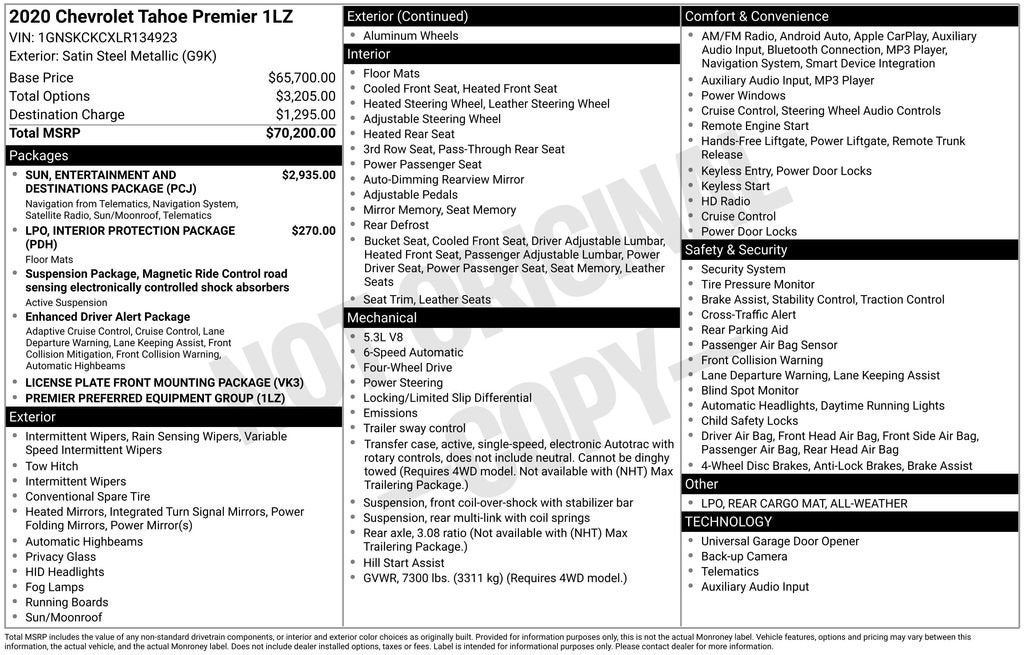 Whether you're looking to transport your family in style, tow your boat or trailer, or simply enjoy the open road, this 2020 Chevrolet Tahoe Premier is the perfect choice. Visit our showroom today and experience the difference for yourself. We're confident you'll be impressed by this remarkable SUV.