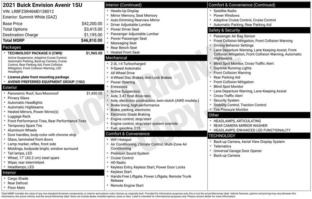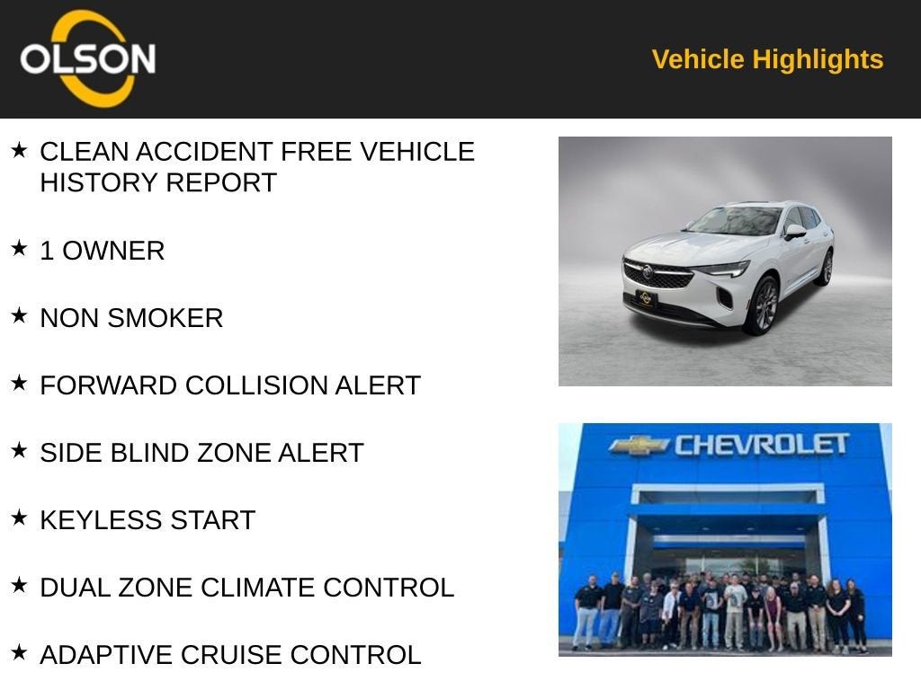 2021 Buick Envision Avenir 2.0L Turbocharged 22/29 City/Highway MPG AWD CLEAN ACCIDENT FREE VEHICLE HISTORY REPORT, 1 OWNER, NON SMOKER, FORWARD COLLISION ALERT, SIDE BLIND ZONE ALERT, KEYLESS START, DUAL ZONE CLIMATE CONTROL, ADAPTIVE CRUISE CONTROL, LANE KEEP ASSIST, AWD, BACK UP CAMERA, Bluetooth®, COOLED SEATS, HEATED SEATS, HEATED STEERING WHEEL, LEATHER SEATS, PANORAMIC ROOF, POWER TAILGATE, REMOTE START, Adaptive Cruise Control, Continuous Damping Control, Enhanced Automatic Emergency Braking, Enhanced Automatic Parking Assist, Enhanced LED Functionality Headlamps, Navigation System, Preferred Equipment Group 1SU, Rear Camera Mirror, Rear Camera Mirror Washer, Technology Package II.