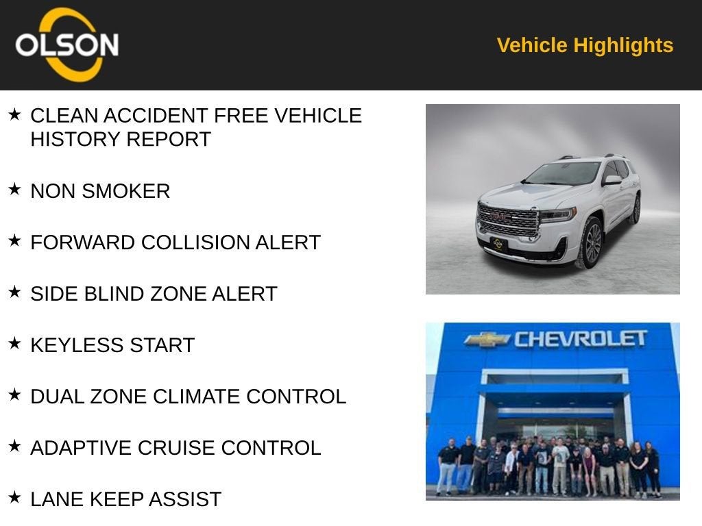 Olson Chevrolet is excited to offer this 2023 GMC Acadia Denali in White Frost Tricoat with a Dark Galvanized/Light Shale Leather interior. This Acadia is powered by a Gasoline 3.6 liter 6 cylinder engine with AWD and Automatic transmission.