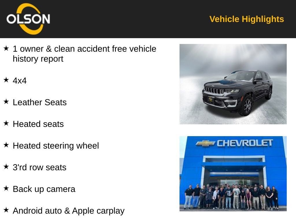 Olson Chevrolet is Family owned and operated In Redwood Falls and Hutchinson. Our business actively participates in the community through Community Events and Sponsorships. We enjoy Collaborating with and supporting local businesses.This 2023 Jeep Grand Cherokee Limited is a truly exceptional vehicle that offers an unparalleled driving experience. Boasting a powerful 3.6L V6 24V VVT engine and 4-wheel drive capabilities, this SUV is ready to take on any adventure. Standout features include:• 1 owner & clean accident free vehicle history report• Leather Seats• Heated seats• Heated steering wheel• 3'rd row seats• Back up camera• Android auto & Apple carplay• Remote start• Forward collision alert• Adaptive cruise control• Lane keep assist• Side blind zone alertThe stunning Midnight Sky Blue exterior is complemented by the 18 Polished/Painted Aluminum wheels, creating a bold and sophisticated look. Step inside and you'll be greeted by the spacious and well-appointed Capri Leatherette interior, offering unparalleled comfort and style.This Grand Cherokee Limited is packed with advanced technology features, including the Uconnect 5 Nav system with a 10.1 display, providing seamless connectivity and navigation. The vehicle also boasts a suite of advanced safety features, such as Blind Spot Monitoring, Rear Cross-Path Detection, and Automatic Emergency Braking, ensuring your peace of mind on the road.With an impressive 19 city / 26 highway MPG, this Jeep Grand Cherokee Limited delivers exceptional fuel efficiency without compromising on power and capability. The 4-wheel independent suspension and Normal Duty Suspension provide a smooth and responsive ride, making every journey a pleasure.Whether you're looking for a capable family SUV or a versatile adventure vehicle, this 2023 Jeep Grand Cherokee Limited is the perfect choice. With its impressive list of features, exceptional performance, and unbeatable value, this SUV is sure to exceed your expectations.Don't miss your chance to experience the ultimate in comfort, technology, and off-road prowess. Visit our showroom today and let us demonstrate why this Jeep Grand Cherokee Limited is the perfect fit for your lifestyle.