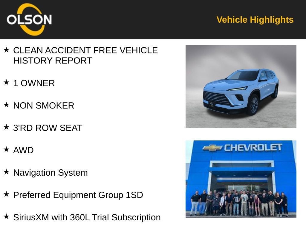 Olson Chevrolet is Family owned and operated In Redwood Falls and Hutchinson. Our business actively participates in the community through Community Events and Sponsorships. We enjoy Collaborating with and supporting local businesses. Olson Chevrolet is excited to offer this 2025 Buick Enclave Preferred in Summit White with an Ebony Premium Synthetic interior. This Enclave is powered by a Gasoline 2.5 liter 4 cylinder engine with AWD and Automatic transmission.